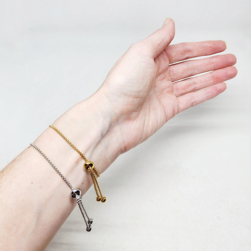 Choose stainless steel (silver-tone) or 18K Gold Plated stainless steel. Adjustable slider clasp.